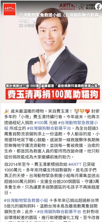 「台灣貓狗聯合勸募平台」9日在臉書粉專發文指出,費玉清再次透過經紀人捐款100萬元,給台灣動物緊急救援小組(ARTT)所成立的台灣貓狗聯合勸募平台,為全台超過3萬隻弱勢流浪貓狗添上一份溫飽。內容還提到,自2014年至今,費玉清累積捐款給ARTT已突破1000萬元,多年來持續支持弱勢貓狗。
